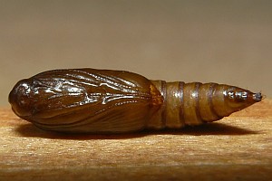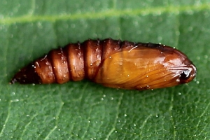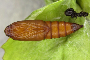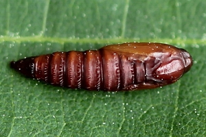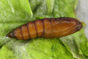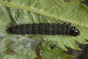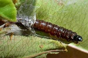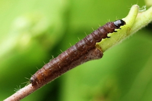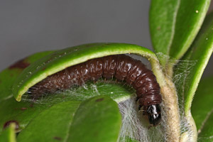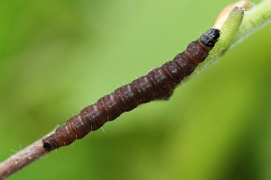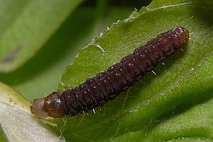 Kennel (1916: 410-411) schrieb pauschal: "Die Raupe ist dunkelbraun mit kaum sichtbaren schwarzen Wärzchen, Kopf, Nackenschild und Analklappe sind schwarz; sie lebt von April bis Ende Juli in mehreren Generationen polyphag an vielen niederen Pflanzen in versponnenen Blättern."