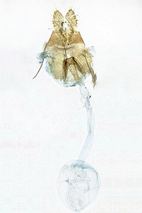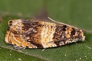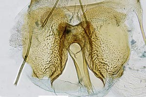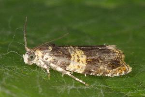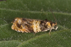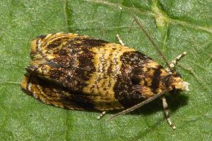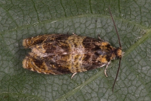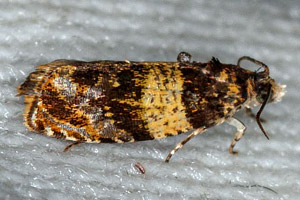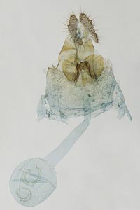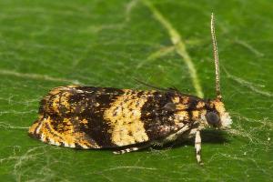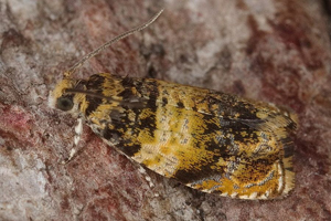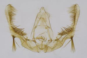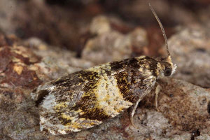 Bei Barrett (1906: 70) ist dann sehr viel ausführlicher zu lesen: "Larva shining pale yellow, with the alimentary canal in places showing blackish green; head round, black; thoragic plate reddish; anal plate rather large, shining, reddish or reddish black." Und zur Lebensweise heißt es: "April and May. "Feeding in silken galleries in the small patches of Hepaticae which grow on smooth-barked trees as lilac, ash, &c. There is no visible external sign of the presence of the larva within the tufts of liverwort, but if these are gently sundered from the trunks the galleries at once become visible; these are of thick white silk, covered with gnawings from the bark and debris of the liverwort." (W. Warren.) Other writers say upon plum, cherry, oak and birch trees."