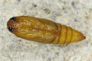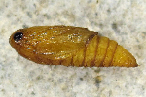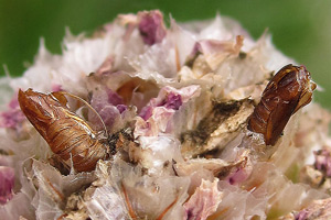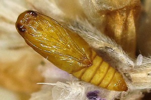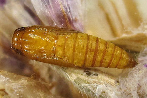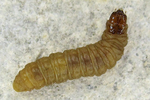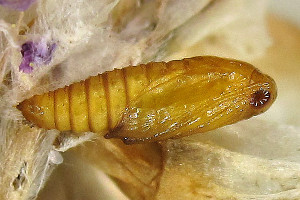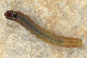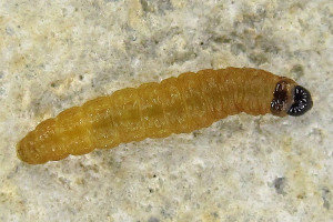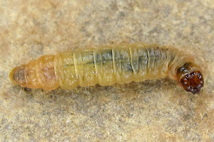 Meyrick (1895: 456) berichtete dann: "Larva pale greenish-grey, or sometimes dark brown; head light brown; plate of 2 black: in shoots and flower-heads, and on leaves of Armeria; 4, 5, 8."