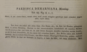 - Erstbeschreibung: Fischer von Röslerstamm, J. E. (1834–1843): Abbildungen zur Berichtigung und Ergänzung der Schmetterlingskunde besonders der Microlepidopterologie als Supplement zu Treitschke's und Hübner's europaeischen Schmetterlingen, mit erlaeuterndem Text: I-V, 6-304, Alphabetisches Register mit Synonymen [i]-[iv], pl. 1-100. Leipzig (Hinrichs). — Digitalisat von Google Books im Viewer der Hathi Trust Digital Library: [186], [pl. 65].