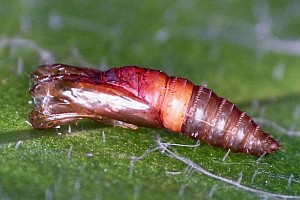 1: Exuvie, Deutschland, Bayern, Landkreis Garmisch-Partenkirchen, Ohlstadt, Bergmischwald, 750 m, Raupenfund am 26. Mai 2013, e.l. 16. Juni 2013 (leg., cult. & Foto: Thomas Guggemoos), conf. Falter Helmut KolbeckForum