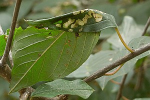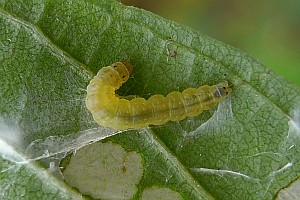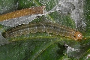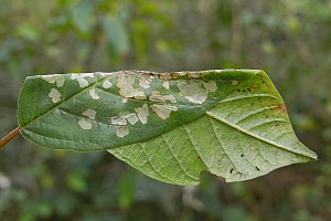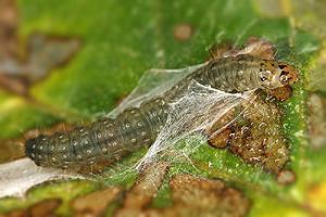Schütze (1931) fasst ganz ähnlich zusammen: "In zwei Generationen polyphag, besonders an Rhamnus frangula, selten Rhamnus cathartica, Cornus sanguinea, Ligustrum, Prunus cerasus usw., jung in einem zusammengefalteten Blatt, später zwischen zwei flach übereinander gesponnenen Blättern, die Innenseite glasig ausfressend oder skelettierend. Verwandlung in der Wohnung, zweite Generation nach der Überwinterung (Sorhagen)."