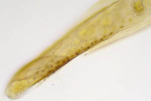 Gartner (1865: 158) beschrieb die Raupe ausführlich unter dem Namen "Grapholitha siculana" - aber vermutlich hatte er dabei nicht A. apicella vor sich (aber was sonst ?): "siculana H. B. IV. p. 287. Die Flugzeit des Falters ist im Mai, dann aus der zweiten Generation nach Mitte Juni bis Juli, häufig auf sonnigen Bergen mit Gesträuch, auf dem Kuliberge, Hadiberge. Die Raupe lebt nach Tischer im Juni und im Herbste. Ich habe Siculana in der Puppenform am 22. April häufig auf Ligustrum vulgare gefunden. Wenn sich dieser Strauch begrünt, so lassen sich die an den Zweigen haftenden dürren Blatttheile sehr leicht wahrnehmen - untersucht man dieselben, so wird man häufig darin Puppen finden, welche in einem umgesponnenen Hohlräume leben. Der Falter begann sich vom 31. April an zu entwickeln. Am 4. Juni bemerkte ich an niederen Sträuchern von Cornus sanguinea Blätter, deren Theile nach unten umgelegt waren und worin sich in einem ausgelegten Gespinnste junge Räupchen von Siculana befanden, Aeltere ziehen die Blätter flach an einander, enthäuten sie von innen, bewohnen jedoch die dazwischen angebrachten weissen flachen Gespinnste. Die Raupe, welche die Grösse von 6'" erreicht, ist von Farbe schmutzig-grünlich, erdbraun; Kopf, Hals- und Afterschild schmutzig-gelb, erster mit zwei schwarzen Puncten in den Wangen und letzter mit zwei nebeneinander stehenden schwarzen Flecken; der Rücken in jedem Segmente mit vier ziemlich auffallenden Puncterhöhungen, welche fast in Quadrat gestellt sind, lateral auch solche, worin sich je ein Haar befindet. Die trüb theegrüne Körperfarbe ist in der Lateralgegend wie abgeschnitten, und es tritt ein lichtes Trübgelb ein; Krallen in den Spitzen braun 5 Körper vorn und hinten verdünnt. In Bewegungen agil, und schnellt sich oft in die Höhe. Die Puppe ändert in der Grösse von 3 —4'", ebenso auch in der Farbe je nach dem Alter. In der Jugend ist sie mit Ausnahme des schwarzbraunen Cremasters und des Thorax, lichtbraun, im Alter hat sie dunkle grünlich-braune Flügelscheiden, dorsal dehnt sich der ganzen Länge nach ein dunkler brauner Schatten; Flügelscheiden lassen 5 Ringe frei; Abdominale mit Stachelkränzen; Afterstück schwarzbraun mit lichten Härchen besetzt. Bewegungen lebhaft."