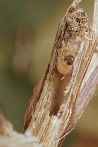 Schütze (1931: 82) berichtet dann, basierend auf dieser Quelle: "In den Ranken von Humulus lupulus. Ob sie sich in der ersten Jugend von Blättern und Früchten nährt, was immerhin möglich wäre, oder ob sie, was mir wahrscheinlicher scheint, von Anfang an in den Stängeln, namentlich den jungen oberen Endtrieben lebt, wo ich öfter Fraßspuren fand, und sich erst später zur Überwinterung in die dicken und festen Ranken begibt, habe ich nicht feststellen können. Verwandlung Ende Mai. Falter Juni bis Juli. Flugzeit 8 bis 14 Tage. Hauptsächlich an sonnigen Stellen, günstigste Fangzeit 12 bis 14 Uhr, gegen Abend fliegt sie nicht (Hinneberg.)." Dabei hatte schon Schütze(1896) entdeckt, dass noch eine weitere Art der Gattung - Grapholita discretana - auf ganz ähnliche Weise in Hopfen lebt.