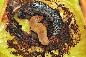 1-2: Schweden, Skåne, 10. Juni 2017, Frucht von Spitzahorn (Acer platanoides) mit Raupe (leg., det. & Fotos: Fredrik Skeppstedt)