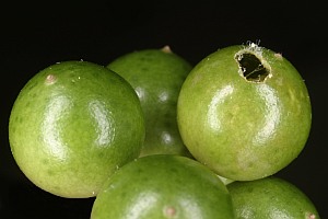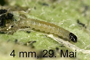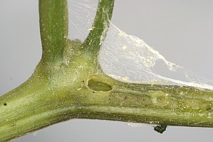 1-6: Daten wie Eizucht 1-7, verschiedene Individuen. [1]: Fraßbild der Eiraupen, 26. Mai 2009, [2]: Gespinst einer 4 mm langen Raupe an Blattunterseite, unter dem Schabefraß ausgeführt wird, 29. Mai 2009, [3]: Wohngespinst an Fruchtstand, von dem aus Beeren befressen werden, 21. Juni 2009, [4-5]: besetzte unreife Beere, ungeöffnet / geöffent, 23. Juni 2009, [6]: Einbohröffnung in Stängel, 26. Juni 2009Forum