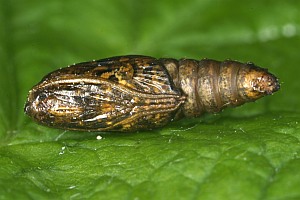 1-3: Kokon (9 mm) zwischen Blättern eingesponnen / freipräpariert / Puppe freipräpariert des unter Lebendfoto 3-4 gezeigten Falters. Fotos vom 17. April 2010Forum
