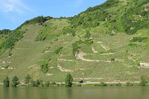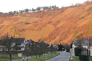 Auf Bild 3 sieht man die besondere Wärmegunst des Standorts, der im Hochwinter abends um 17.00 Uhr noch voll in der Sonne liegt. Ungefähr ein Drittel des Hangs liegt seit mehreren Jahren brach, die Birke als dominierendes Pioniergehölz breitet sich rasant aus. An der Hangkante lugen die Bungalows des Parks "Landal Montroyal" ins Tal. Zwischen den Häusern der Ortschaft Wolf im Vordergrund und dem sonnenbeschienenen Hang fließt die Mosel (im Bild 3 nicht sichtbar). (Armin Dahl)
