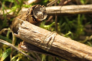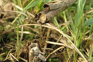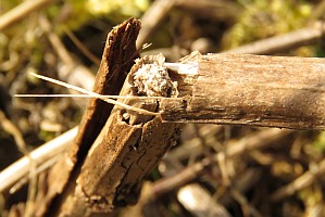 Ruben Meert teilt dazu mit (Mail vom 26. März 2018): "a very interesting species to look for in winter: the larvae feed in autumn in the roots of Senecio sp. Later it moves upwards into the dead stem and gnaws it in a way that it breaks off easily in winter (very similar to the feeding pattern of Chamaesphecia nigrifrons on Hypericum). The hole in the center of the stem is filled with silk en stem particles."