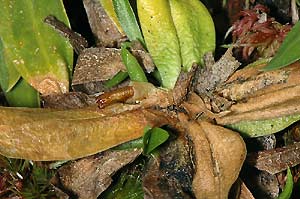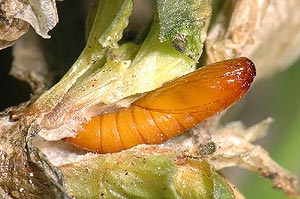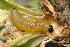 Fotos der Raupen und des Fraßbildes gibt es z.B. bei Schmid (2019: 542-543). Dort heißt es: "Raupennährpflanze ist der Blaue Enzian (Gentiana clusii und G. acaulis). Die Jungraupe lebt zuerst in den grundständigen Blättern, wo sie blasenartige Minen erzeugt (1, 2). Später geht sie in den Stängel und bohrt sich darin recht tief Richtung Wurzel (3, 4). In diesem Gang überwintert sie [...]".