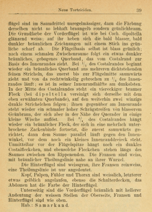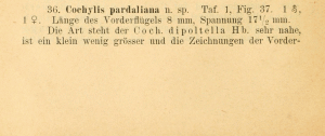 - Erstbeschreibung: Kennel, J. (1899): Neue Tortriciden. Aus den Sammlungen der Herren Dr. O. Staudinger und Th. Seebold. — Deutsche entomologische Zeitschrift Iris 12 (1): 1-43, pl. I.