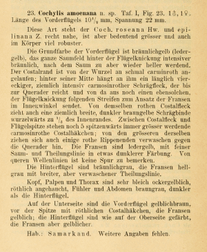 - Erstbeschreibung: Kennel, J. (1899): Neue Tortriciden. Aus den Sammlungen der Herren Dr. O. Staudinger und Th. Seebold. — Deutsche entomologische Zeitschrift Iris 12 (1): 1-43, pl. I.