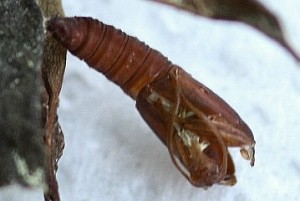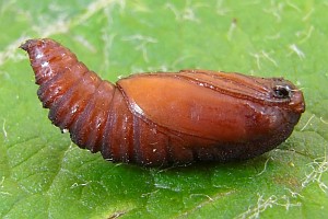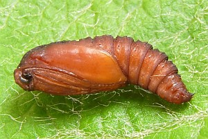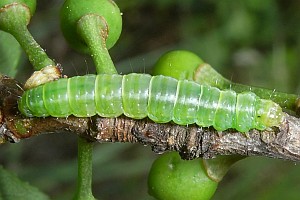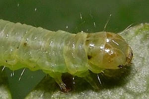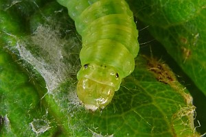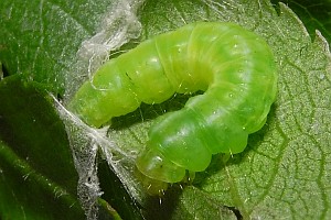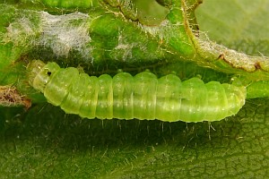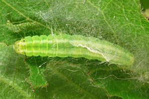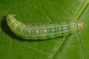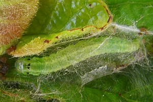 Kennel (1910: 214) hatte gemeldet: "Die Raupe ist hellgrün mit braunem Kopf und bräunlichgrüneni Nackenschild. Sie lebt vom September an überwinternd zwischen zusammengehefteten Blättern von Crataegus, Prunus, Pyrus, Betula und verpuppt sich im Mai in ihrer Wohnung, aus der sie durch Klopfen gesammelt werden kann."
