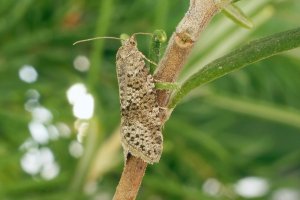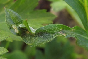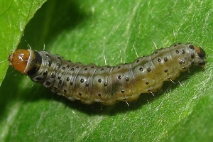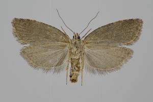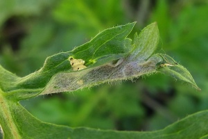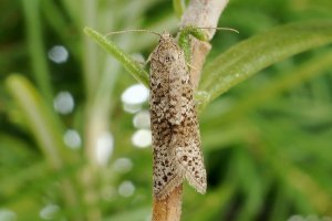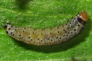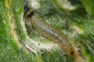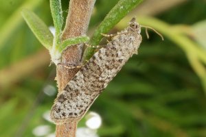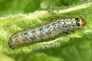 Schütze (1931: 184) bietet dann eine sehr viel längere Liste von eigenen Raupenfunden: "Die Raupe habe ich an folgenden Pflanzen getroffen: Alchemilla, Anchusa, Antennaria, Anthyllis, Artemisia, Beta, Centaurea, Chenopodium, Cirsium, Geum, Lathyrus, Linaria, Medicago, Melampyrum, Orobus, Peucedanum, Pisum, Plantago, Ranunculus, Rumex, Sedum, Solidago, Stachys, Trifolium, Veronica, Vicia. — Sie spinnt alle Blätter einer Sprossspitze zusammen und frisst die Blätter vom Rande aus oder spinnt ein Gewebe über sich und frisst in die Blütenknospen ein oder verzehrt Blattstängel. Sie kommt von Mai bis Ende Juli vor. Ihre Farbe ist blauweißlich oder blaugrau, mitunter ziemlich dunkel. Das Rückengefäß erscheint durch die Haut dunkel, ebenso die rotbraunen Testikeln. Wärzchen groß, schwarz. Die Farbe von Kopf, Nackenschild, Analklappe und Brustfüßen stimmt mit voriger Art überein. Jüngere Raupen haben ganz schwarzen Kopf."