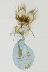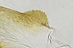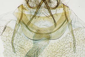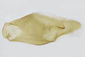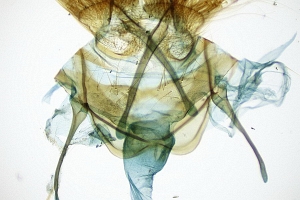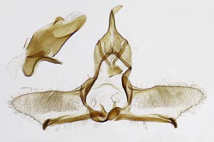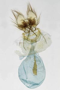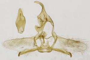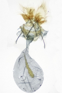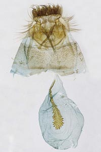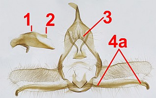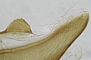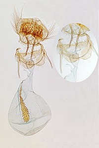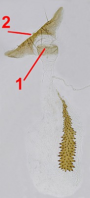 - Aedeagus kurz, in der Mitte bauchig verdickt (1, wichtigstes Einzelmerkmal! Beim Einbetten wird diese Verbreiterung durch das Flachdrücken noch verstärkt, was bei der Beurteilung des Fotos zu berücksichtigen ist), bei C. alticolana ist er schlanker und etwas länger