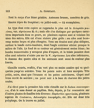 Constant (1884: 212) beschrieb nicht nur den Falter sondern auch die Raupe, die er zuerst an Sedum anacampseros fand, dann aber noch an weiteren, ganz unterschiedlichen Pflanzen: "Mais, depuis, je l'ai rencontrée sur d'autres plantes de familles très diverses : Euphorbia cyparissias, plusieurs espèces de Centaurea, Adenostyles leucophylla, etc. Elle est donc très polyphage. On la trouve en juillet."