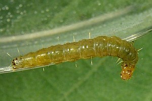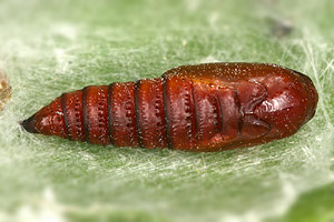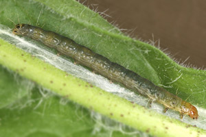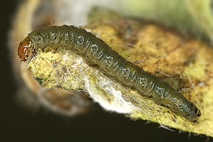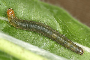 Kennel (1910: 103) stellte zusammen: "Die Raupe ist heller bis dunkler schmutzig grün, der Kopf rotbraun, das Analschildchen gelb, ringsum schwarz gefleckt, die Wärzchen sind klein, schwarz, das Nackenschild ist nicht ausgezeichnet. Sie lebt an Vaccinium uliginosum, Lotus corniculatus, Scabiosa columbaria, Plantago media, Potentilla tormentilla, Statice armeria, und noch an anderen Pflanzen der Waldwiesen des sumpfigen und moorigen Bodens vom Mai bis Juli an den unteren Blättern, oder am Boden in röhrenförmigen Gespinstgängen oder in einem schotenförmig zusammengehefteten Blatt; auch in versponnenen Blütenköpfen."