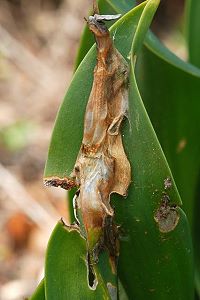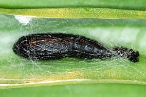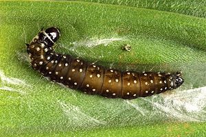 Kennel (1910: 183) hatte zusammengefasst: "Die Raupe ist schwarz, mit hellen Wärzchen, Kopf und Nackenschild sowie die Analklappe sind glänzend tiefschwarz. Sie lebt im Januar bis März, wohl vom Vorjahr her, an Scilla maritima und Asphodelus."