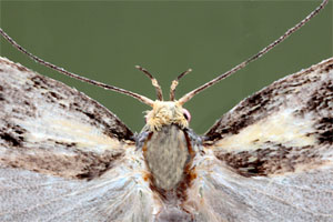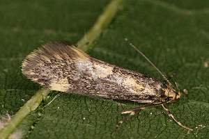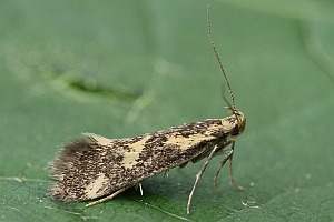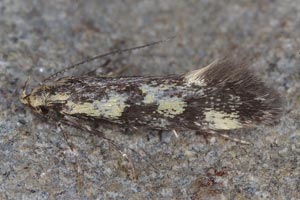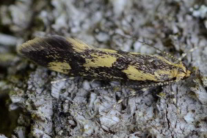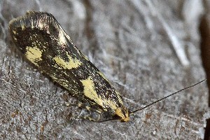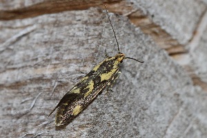 Denisia stipella hat einfarbig dunkle Fühler, einen rein gelben Kopf und ein dunkles Palpen-Endglied mit höchstens angedeutet gelber Spitze (rechtes Bild). (Rudolf Bryner)