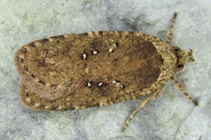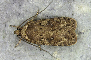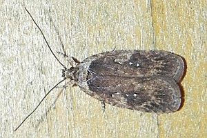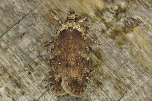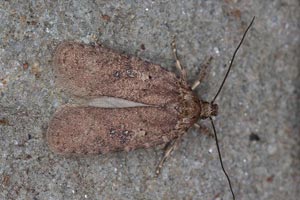Agonopterix ciliella: Kopf dunkelbraun. Im Bereich der Nahtlinien oft dunkler bis schwarz.