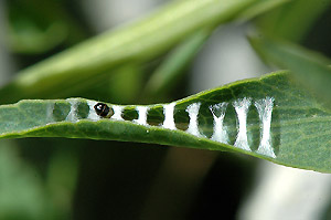 3: Befallsbild durch Jungraupe (Individuum wie Raupenbild 3): Schweiz, Wallis, Fully, 1950 m, Peter Sonderegger & Rudolf Bryner leg. Raupen an Laserpitium siler 14. Juli 2007 (Freilandaufnahme: Rudolf Bryner), cult. & det. Rudolf Bryner