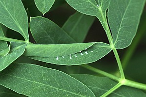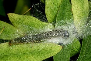 1, Rosskümmel (Laser trilobum) + 2, Berg-Laserkraut (Bergkümmel, Laserpitium siler): Österreich, Niederösterreich, Gumpoldskirchen, 22. Mai 2011, jeweils mit einem Blattumschlag mit Raupe ( in ähnlicher Weise werden manchmal auch 2 Blättchen von zwei zufällig zusammenstoßenden Blättern zusammengesponnen. Die Wohnungen der Raupen unterscheiden sich immer sehr deutlich von jenen der Agonopterix alpigena, die an diesem Fundort ebenfalls vorkommt und an Laserpitium siler wirre Blättchenknäuel erzeugt) (Freilandfotos & Anmerkung Peter Buchner)