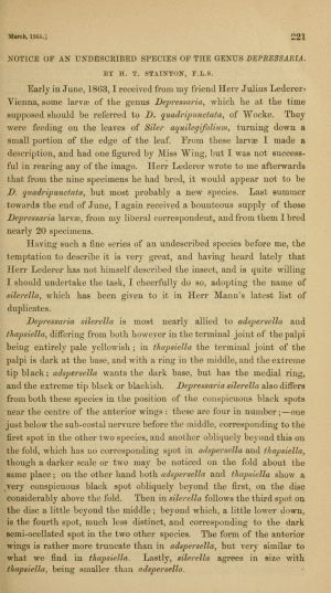 - Erstbeschreibung: Stainton, H. T. (1865): Notice of an undescribed species of the genus Depressaria. — The Entomologist's Monthly Magazine 1: 221-222. London (John van Voorst).