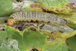 1: Anfangsgespinst an Peucedanum cervaria, das meistens von mehreren Raupen bewohnt wird: Schweiz, Freiburg, Mont Vully, 520 m, 29. April 2006 (Foto & det. gemäß des damaligen Kenntnisstandes als A. selini Rudolf Bryner, corr. 14. Jänner 2018 Peter Buchner