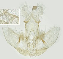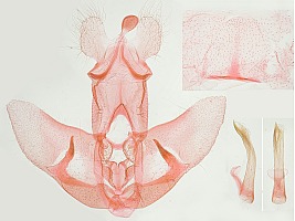 1-2: ♂, Paratypus: Russland, Dagestan, Mt. Tarki (Nord-Kaukasus), 16. - 20. Juni 1933, leg. Raupen an Ferula sp. M.A. Ryabov, coll. ZIN St. Petersburg (Präparation & Lagerung der Teile in Glyzerin: Alexander Lvovsky, weitere Präparationsschritte & Mikrofotos: Peter Buchner) ([1]: Standard-Präparat, [2] Foto vor Reinigung und Färbung zur Verdeutlichung der Cuiller-Verdunkelung, linker Anellus-Fortsatz vergrößert als Einschub)