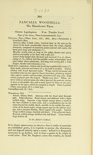 Ja, wenn da nicht der Name wäre ... denn das Tier heißt jetzt nicht Pancalia cribbella, sondern Pancalia woodiella. Und tatsächlich müssen Sie in der Erstbeschreibung lesen: "The only specimen I have seen of this beautiful moth, which is larger than the others, is a female; it was taken on Kersall-Moor the middle of last June by Mr. R. Wood, of Manchester, to whom I have the pleasure of dedicating it". Mr. Wood? Der hat den Falter doch nie lebend gesehen - aber jetzt wurde er berühmt! Stellen Sie sich also vor, Ihre Freude an der neuen Art ist also erst einmal leicht getrübt, aber jetzt wollen natürlich auch andere von Ihrer ganzen Schachtel voll mit diesen Tieren ihr Exemplar haben. Ja, wenn es cribbella hieße, dann wären Sie stolz und großzügig - Sie haben ja noch genug. Aber so? Nein, die Schachtel bleibt zu! Und nein, unter diesen Umständen sammeln Sie überhaupt nicht mehr, nie mehr!