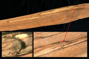 6: die Schlupföffnung an einem Ende der Mine ist halbkreisförmig und bereits von der Raupe vorbereitet worden; einige Flügelschuppen im Bereich des Schlupflochs zeugen vom Schlüpfen des Falters; die Exuvie bleibt in der Mine zurück: Schweiz, Waadt, Neuenburgersee, 430 m, 31. Januar 2024 Minen an Phragmites australis, e.l. 1. März 2024 (leg., cult. & Foto: Rudolf Bryner)Forum