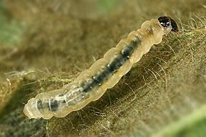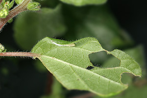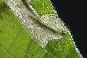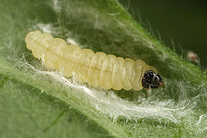 Die Raupe miniert in Blättern von Brennnesselgewächsen (Urticaceae): Koster & Sinev (2003) nennen Parietaria officinalis (Aufrechtes Glaskraut), Parietaria pennsylvanica (Pennsylvanisches Glaskraut) und Pilea pumila; bladmineerders.nl [Artseite auf bladmineerders.nl] ergänzt noch Parietaria judaica (Ausgebreitetes Glaskraut).