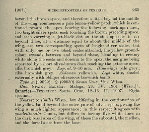 - Erstbeschreibung: Walsingham (1908): Microlepidoptera of Tenerife. — The Proceedings of the Zoological Society of London for the Year 1907: 911-1034 + pl. LI-LIII.