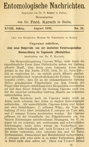 - Erstbeschreibung: Karsch, F. (1892): Caprona adelica, eine neue Hesperiide von der deutschen Forschungsstation Bismarckburg im Togolande (Westafrika). — Entomologische Nachrichten 18 (16): 241-244. [Digitalisat auf biodiversitylibrary.org]