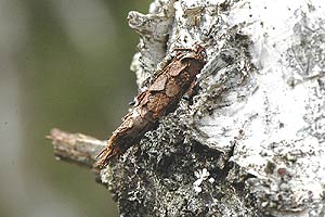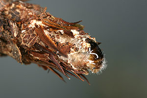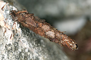Anders ist das Verhalten bei den beiden Unterfamilien Epichnopteriginae und Oiketicinae. Hier verbleiben die weiblichen Puppen auch beim Schlüpfen vollständig im Raupensack. Die Puppenhülle wird am Kopfende lediglich aufgesprengt. Nur in den Stunden des Anlockens guckt dann höchstens der Kopf des Weibchen ganz knapp aus dem hinteren Sackende (Falterbilder 4 und 5).