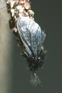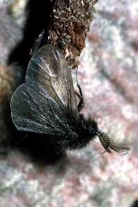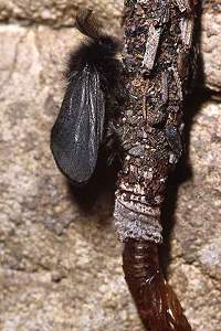 Die Männchen sind in der Lage, ihre Abdomen teleskopartig auszudehnen. Bei der Paarung schieben sie ihr Abdomenende mit den Kopulationsorganen am Kopf des Weibchens vorbei in den Raupensack und schliesslich in die nur vorne aufgesprengte Puppenhülle hinein, bis schliesslich die Kopulationsorgane am Hinterende des weiblichen Abdomens erreicht sind. (Falterbilder 2 und 3). (Rudolf Bryner)