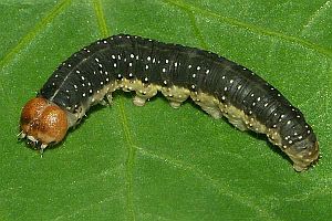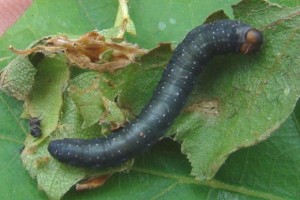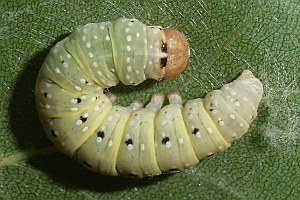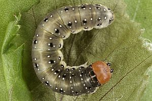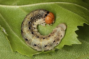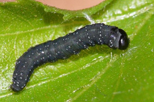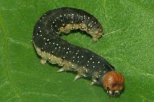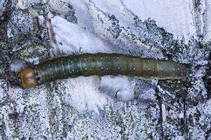 1: Raupe in gefaltetem Blatt, Deutschland, Sachsen, Dübener Heide, Umgebung von Eilenburg, an Birke (Betula pendula), 18. Mai 2007 (det. & leicht manipuliertes Freilandfoto: Heidrun Melzer)Forum