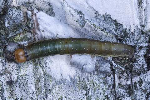 5: L3: Deutschland, Niedersachsen, Region Hannover, Altwarmbüchener Moor, Stadt Lehrte, Ortsteil Klein-Kolshorn, 60 m, Raupe 23. April 2018 zwischen zwei versponnenen Birkenblättern (Betula cf. pendula), Zuchtfoto 28. April 2018 (cult., det. & fot.: Tina Schulz)