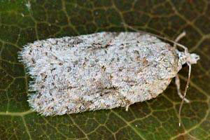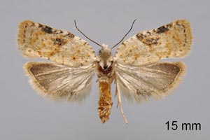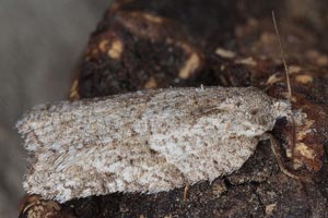 Schütze (1931) berichtet zur Raupe: "An Hecken von Ulmen zwischen zwei gekreuzt übereinander gesponnenen Blättern". Und Razowski (1984: 280) schreibt: "Die Raupen leben in aufeinandergesponnenen Blättern von Ulmus campestris L. (Kennel 1908: 85) und Ulmus scabra Mill. in Bosnien (Batinica 1967: 188)."