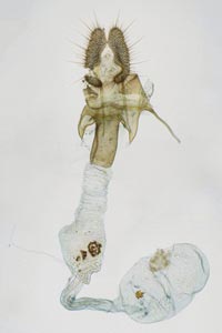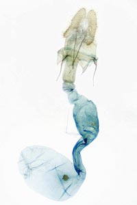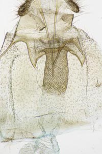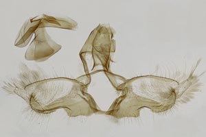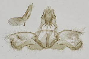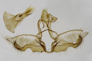 Charakteristisch sind u.a. die Cornuti im Aedoeagus (2 große nebeneinander und ca. 3 kleine darunter in einer Gruppe) sowie die Form der Socii: schmal und spitz. (Peter Buchner)