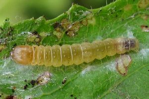 Kennel (1908: 86-87) listet wenig später auf: "Die Raupe (Tr. X. 3. 137) der Stammform und der Var. asperana ist gelblich oder grünlichgelb, mit etwas dunklerer oder bräunlich durchscheinender Rückenlinie, Kopf und Nackenschild gelblich bis gelblichbraun oder grünbraun. Sie lebt von Ende Mai bis Juli zwischen zwei zusammengesponnenen Blättern von Pyrus malus und communis, Crataegus, Prunus spinosa und avium, Rosa, Poterium sanguisorba, Corylus, Ulmus, Vaccinium myrtillus, in den Alpen auf Cotoneaster. Der Falter fliegt vom August an und überwintert."