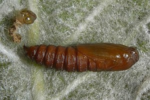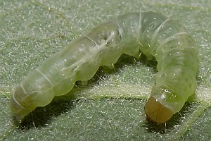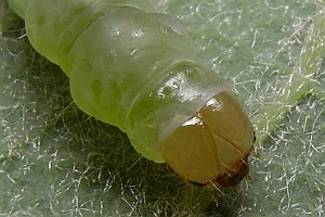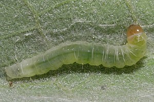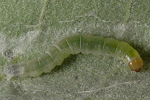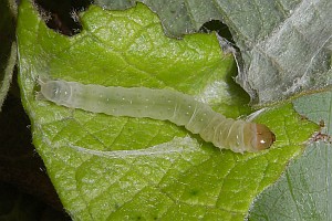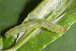 Karsholt & al. (2005: 98) schreiben zur Raupe: "The larva is, when young, whitish green, later light green with almost similar coloured pinacula and a darker dorsal line. The head is honey-coloured with some black dots; thoracic plate and legs are light green. It feeds in late May and in June in folded leaves, or between two leaves, of especially Salix caprea, occasionally also on Betula and in Norway also on Populus tremula. It pupates in the second half of June between the leaves or among moss. The pupa is light brown, its proximal end is broad, horn-shaped, with two strong, curved thorns (Fischer von Röslerstamm 1839: 142, pl. 54). According to Bradley et al. (1973: 219) it also feeds on Betula, Corylus and Alnus."