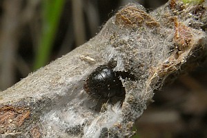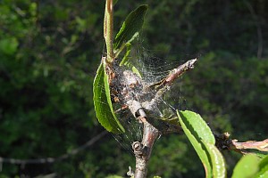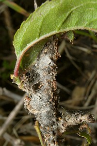Schon Zincken (1818: 141) formuliert in seiner Erstbeschreibung der Art treffend und anschaulich: "Die Raupe im Mai und Anfang Jun auf Schwarzdorn (Prunus spinosa) in sehr langen, manchmal über einen Fuss messenden, braunen, häutigen, ziemlich festen, längs den Zweigen gesponnenen Kanälen." Schütze (1931) fasst gut hundert Jahre später den damaligen Kenntnisstand zusammen: "An freistehenden Schlehenbüschen in seidenen, mit Kot besponnenen Röhren, die den Zweigen aufliegen (Stange, Wocke). Diese dunklen Röhren sind etwas gekrümmt und finden sich niemals am jüngsten Wuchs. Sorhagens Angabe: An Rhamnus cathartica ist wohl Verwechslung mit Rhodophaea legatella Hübner Acrobasis legatea (Schütze)." - Es hat sich also wenig geändert.