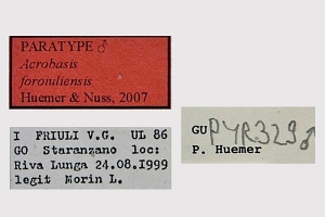 Huemer & Nuss (2007: 128): “Holotype ♂. ‘Italia, Veneto, Caorle, Brussa, Valle Vecchia W, 27.VIII.2004, leg. Huemer’ (TLMF).” — Paratypen: 5 ♂♂ und 6 ♀♀, alle aus Nordost-Italien.