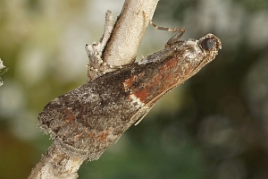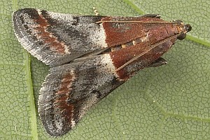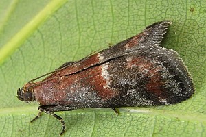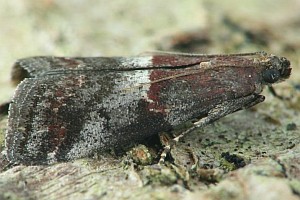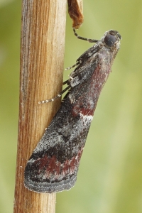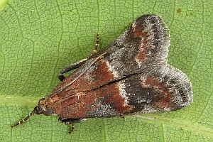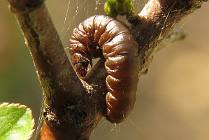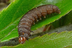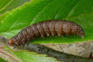Schmid (1886: 36) fand die Raupe in Dechbetten in Bayern und schreibt dazu: "R. wie bei Suavella und mit dieser auf Schlehen." Schütze (1931) nennt nicht nur eine Nahrungspflanze und macht nähere Angaben zur Lebensweise der Raupe - er korrigiert auch Fehler in der Literatur: "Rhodophaea marmorea Haworth (epelydella) Raupe Mai, Falter Juli. An Prunus spinosa, nicht wie vorige [also Acrobasis suavella] in fester Gespinströhre, zwischen röhrenförmig zusammengehefteten, dem Ästchen anliegenden Blättchen. Sorhagens Angabe: An Crataegus beruht auf Verwechslung mit Olethreutes achatana Fabricius [jetzt Ancylis achatana], die an Crataegus in ähnlicher Weise lebt wie Rh. marmorea an Prunus spinosa (Schütze)." Das hinderte spätere Autoren allerdings nicht daran, diesen Fehler fortzuschreiben und weitere (Sorbus aucuparia) zu ergänzen. Belegt ist bisher nur Prunus spinosa und Goater (1986: 120) schreibt zur Raupe in Großbritannien: "Feeds in May on Blackthorn (Prunus spinosa), preferring low stunted bushes. Makes a web on the twigs, which resembles a small piece of sheep's wool. Pupates in the web in a brownish Grey cocoon covered with frass and leaf-fragments."