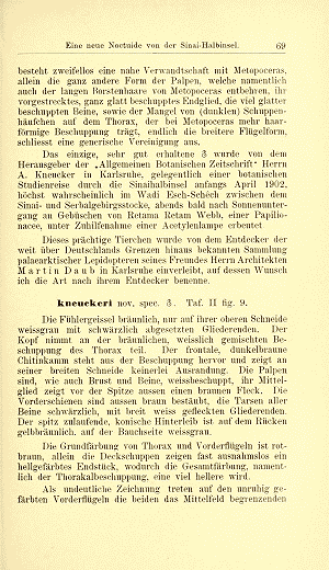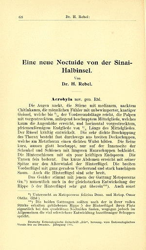 - Erstbeschreibung: Rebel, H. (1903): Eine neue Noctuide von der Sinai-Halbinsel. — Deutsche Entomologische Zeitschrift Iris 16 (1): 68-70, pl. II fig. 9. Dresden-Blasewitz (Elbgau-Buchdruckerei und Verlagsanstalt).