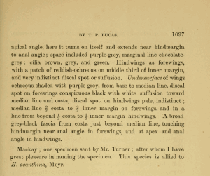 - Original description: Lucas, T. P. (1890): On Queensland and other Australian Macro-Lepidoptera, with localities, and descriptions of new species. — The Proceedings of the Linnean Society of New South Wales. Second series 4 (4): 1065-1099. Sydney (F. Cunninghame & Co.).