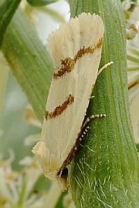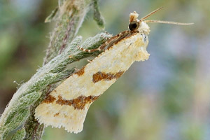 Schütze (1931) teilte dann zur Raupe mit: "In den Blüten, später im Stängel von Eryngium campestre (Disqué), verspinnt sich darin (Rössler)." Wegner (2015) meldet aus dem im Wendland: "29.04.2006 und 04.03.2012, Larven in Stängeln und Seitenzweigen vorjähriger Pflanzen des Feldmannstreu (Eryngium campestre). Am 22.06.2013 wurde ein Falter bei der Eiablage an einem Blütenstand beobachtet." - Gentiana acaulis wird nicht mehr wiederholt - die Meldung dürfte sich als falsch herausgestellt haben.