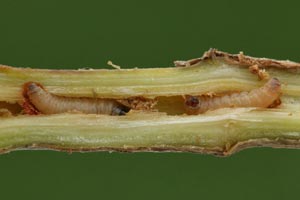 Kennel (1913: 234) meinte dann: "Die Raupe ist gelblichweiß mit dunkelbraunem Kopf, blasser braunem Analschildchen und zwei ebensolchen Fleckchen auf dem Halsschild. Sie lebt vom September an zwischen den Samen, später im Stengel von Eryngium campestre, Daucus, Pastinaca, Peucedanum, Angelica silvestris und überwintert daselbst, um sich im April zu verpuppen."