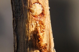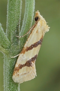 Und dass das alles möglicherweise doch nicht ganz so einfach ist und mit weiteren Überraschungen zu rechnen ist, zeigte auch Heckford (1995: 40): "On 29th April 1990 Dr John Langmaid and I were recording microlepidoptera at Chesil, Dorset. John observed some small round holes in old stems of Conium maculatum which we assumed were made by Aethes beatricella (Walsingham). As this was a species I had not seen I collected a few stems. Moths emerged between May and June and I noticed how similar they looked to specimens of A. francillana (Fabricius) which I had bred from Daucus carota in Devon. In January 1994 I dissected a male from Chesil and to my surprise found that it was not beatricella but francillana, which I believe has not been recorded from Conium maculatum either in the British Isles or on the continent." D.h., alleine von der Nahrungspflanze kann man nicht zweifelsfrei auf die Falter-Art schließen - Überschneidungen der Nahrungsspektren sind nicht völlig ausgeschlossen.